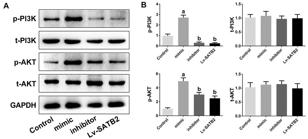 MC3T3-E1 cells were transiently transfected with miR-483-5p mimic and inhibitor to increase or decrease the miR-483-5p expression. The inhibitor and mimic were acquired from GenePharma Co., Ltd. (Shanghai, China) and were transfected utilizing Lipofectamine 2000 (Invitrogen, Carlsbad, CA). The PI3K/AKT signaling pathway was inhibited by treating MC3T3-E1 cells with 10 μM LY294002 (Merck Millipore, Germany) before the miR-483-5p mimic transfection. To overexpress SATB2 in MC3T3-E1 cells, the lentiviral vector system was used. The complete SATB2 coding sequences were amplified and inserted into the core plasmid pLVX-Puro. For the lentivirus production, Lipofectamine 2000 was employed to transfect the recombinant plasmid into HEK293T cells following the manufacturer’s guidelines. The virus supernatant was collected 48 h later and concentrated by ultracentrifugation for 10 min (4,000 g at 4° C). For cell infection, cells were planted in 6-well plates (5×104 cells/well). To explore the correlation between SATB2 and miR-483-5p, MC3T3-E1 cells were co-transfected with miR-483-5p mimic and SATB2-overexpressed lentiviruses (Lv-SATB2). The transfection efficiency was detected 48 h after transduction.