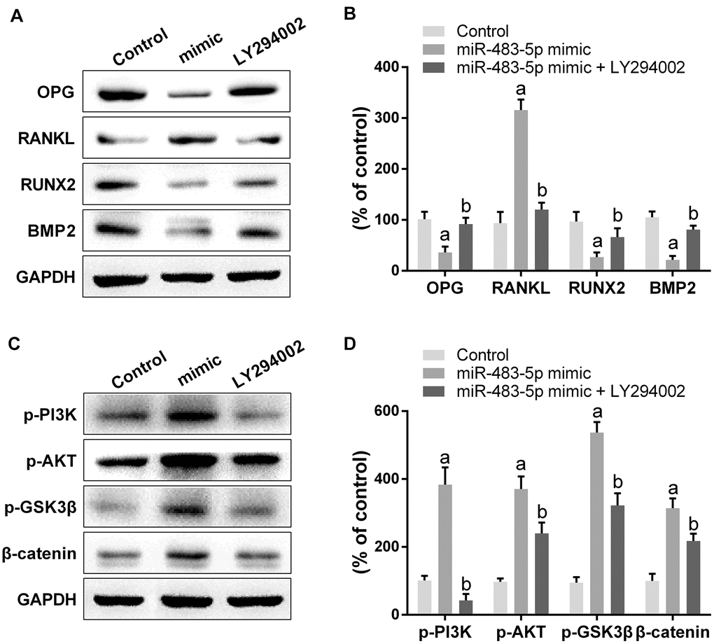 To examine the molecular mechanisms of miR-483-5p and SATB2 on osteoporosis, the downstream cascade PI3K/AKT pathway was analyzed. The miR-483-5p mimic markedly enhanced the PI3K (p-PI3K) and AKT (p-AKT) phosphorylation levels in comparison with the control group. However, miR-483-5p inhibition and SATB2 overexpression reversed the up-regulation of both p-AKT and p-PI3K, which had been induced by miR-483-5p mimic (Figure 4A, 4B). In addition, LY294002 was applied to inhibit PI3K/AKT signaling in the present study. LY294002 significantly reversed the expression of OPG, RANKL, RUNX2 and BMP2 (Figure 5A, 5B). The activated PI3K/AKT and GSK3β/β-catenin (downstream pathway of PI3K/AKT) signaling pathways were also inhibited by LY294002 (Figure 5C, 5D). These findings indicate that PI3K/AKT pathway is implicated in the osteoporosis development and is regulated by SATB2 in MC3T3-E1 cells.