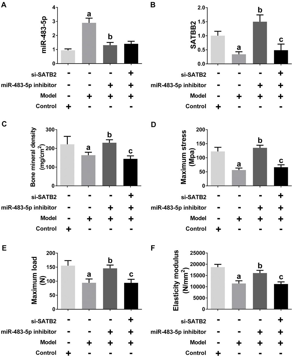 Ovariectomized (OVX) rats were made to simulate the pathological condition of osteoporosis in vivo. Similar to the findings obtained in the cell experiments, the SATB2 expression was down-, while miR-483-5p expression was up-regulated in the model group, and the miR-483-5p inhibitor reversed the expression of both, subsequently (Figure 6A, 6B). siRNA-SATB2 successfully interferes with the SATB2 mRNA expression in rats (Figure 6B). The osteoporosis progress in OVX rats was also measured. In comparison with the control (sham) group, bone mineral density (BMD), elasticity modulus, maximum load and maximum bending stress were significantly decreased in OVX rats, suggesting the model was successfully established. These reduced indicators increased again after miR-483-5p inhibitor transfection (Figure 6C–6F). In addition, BMD and the values of the three biomechanical parameters decreased again after the siRNA-SATB2 injection, indicating that SATB2 is a miR-483-5p downstream gene in OVX rats.