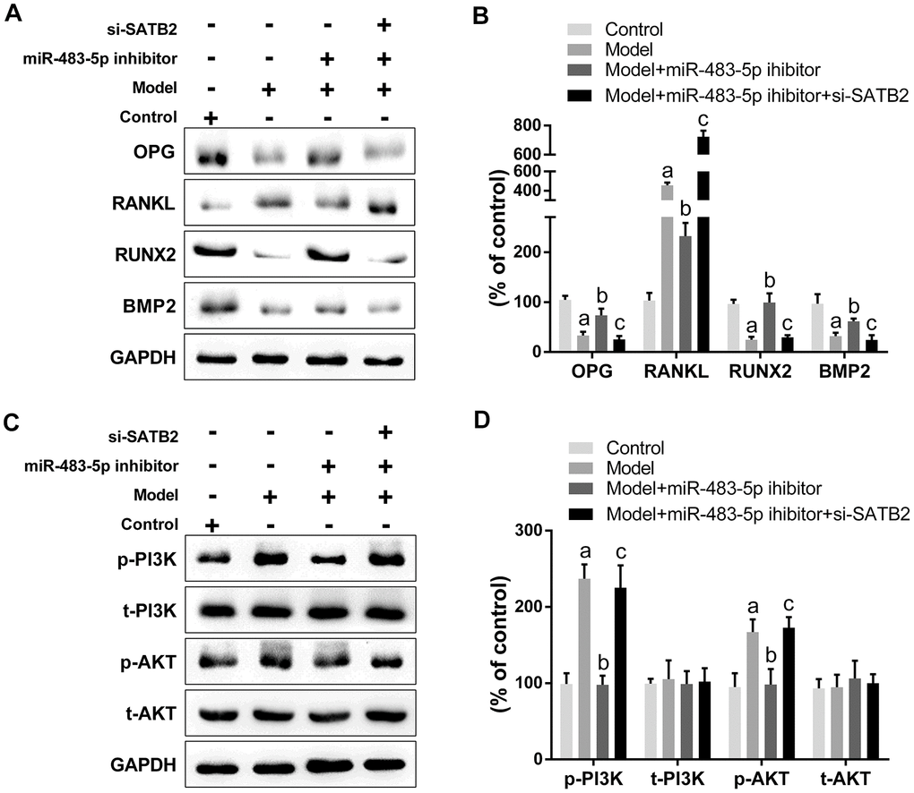 Western blot results unveiled that the expression of OPG, RUNX2, and BMP2 decreased significantly, while the RANKL expression increased in OVX rats. The miR-483-5p inhibitor reversed the expressions of these proteins compared to the model group. Remarkably, si-SATB2 reversed the changes in protein expression induced through miR-483-5p inhibitor (Figure 7A, 7B). Likewise, the AKT and PI3K phosphorylation levels were enhanced in the model group and reduced after the miR-483-5p inhibitor transfection. The siRNA-SATB2 injection successfully raised the p-PI3K and p-AKT levels (Figure 7C, 7D). These findings indicate that PI3K/AKT signaling pathway is the downstream target for the miR-483-5p-SATB2 axis role in OVX rats.