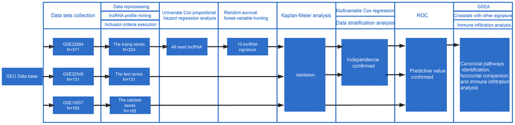 In GEO or other databases, we failed to find a microarray specifically designed for lncRNAs with the requisite clinical information. Therefore, by annotating the probes, we separated a lncRNA profile from total RNA expression data. The gene sequence IDs obtained from the GPL6947 platform mainly contained Unigene ID and Refseq_ID. The “org.Hs.eg.db” package in R was used to obtain three maps of the correspondence between diverse gene sequence IDs, including Unigene ID - Entrez ID, Refseq_ID - Entrez_ID and Entrez ID - Ensembl ID. According to these maps, each Unigene ID and Refseq_ID was mapped to the corresponding Entrez ID. After that, the Entrez ID was further matched to the Ensembl ID, which could be annotated into the corresponding gene type using annotation information obtained from the Ensembl genome database (http://www.ensembl.org/). Ultimately, 11 types of lncRNAs were filtered from the multigene types. Noncoding RNA, lincRNA, processed transcript, TEC, bidirectional lncRNA, macro lncRNA, sense overlapping, sense intronic, retained intron, antisense lincRNA, and 3 prime overlapping ncRNAs were finally retained to generate a re-annotated lncRNA profile containing 911 lncRNAs.