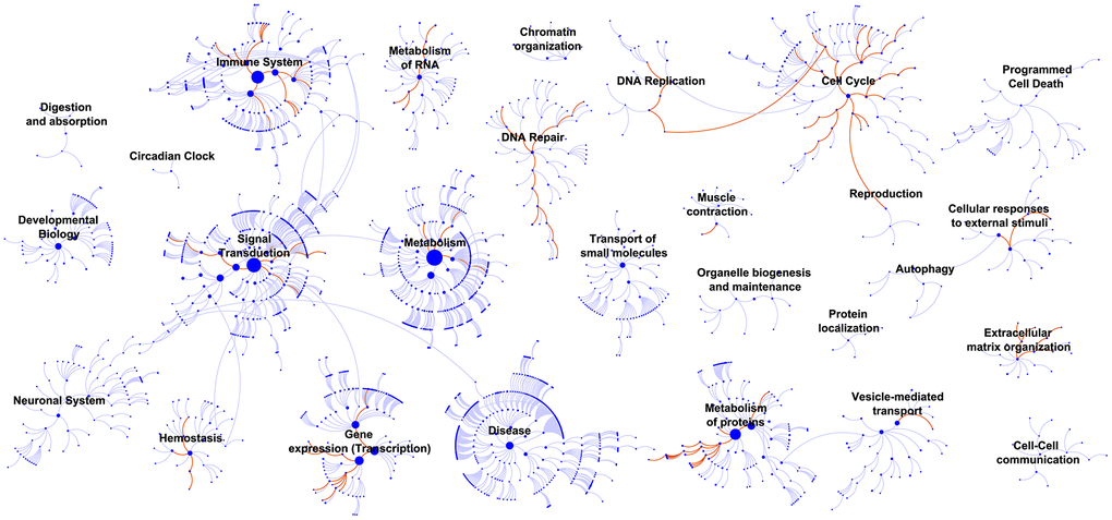 GSEA was conducted between the high-risk subgroup and low-risk subgroup from the GSE32894 series to identify potential cancer-related pathways. GSEA software V3.0 was employed to perform this analysis. Canonical representations of the biological process set, termed “c2.cp.v6.1.entrez.gmt” (1030 gene sets), were used in GSEA. The enrichment results were visualized in Cytoscape software V3.2.1. Dysregulated pathways were mapped in terms of biological processes. Gene sets with false discovery rate (FDR) values <25% and P<0.05 were termed “enriched” after performing 1000 random sample permutations.