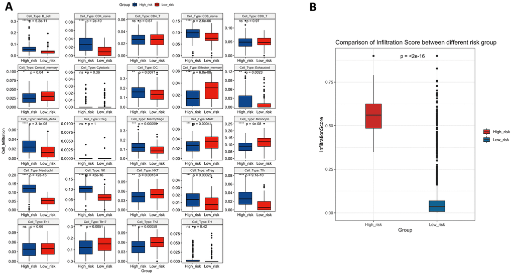 To verify whether the 10-lncRNA signature can reflect the status of the tumour immune microenvironment, we analysed the relationships between the signature and immune cell infiltration. Figure 11A shows that the proportions of infiltrating B cells, naive CD4+ T cells, naive CD8+ T cells, dendritic cells, exhausted T cells, gamma delta T cells, macrophages, monocytes, neutrophils, NK cells, natural regulatory T cells, and follicular helper T cells were significantly enriched in the high-risk group (P<0.05). Central memory T cells, effector memory T cells, mucosal-associated invariant T cells, NKT cells, T helper 17 cells, and T helper 2 cells were significantly enriched in the low-risk group (P<0.05). The infiltration score retrieved from the ImmuCellAI resource is a reflection of the overall tumour immune microenvironment. Figure 11B shows that tumours in the low-risk group have higher infiltration scores, which suggests the connection between the prognostic signature and the inflammatory environment of bladder tumours (P<0.05).