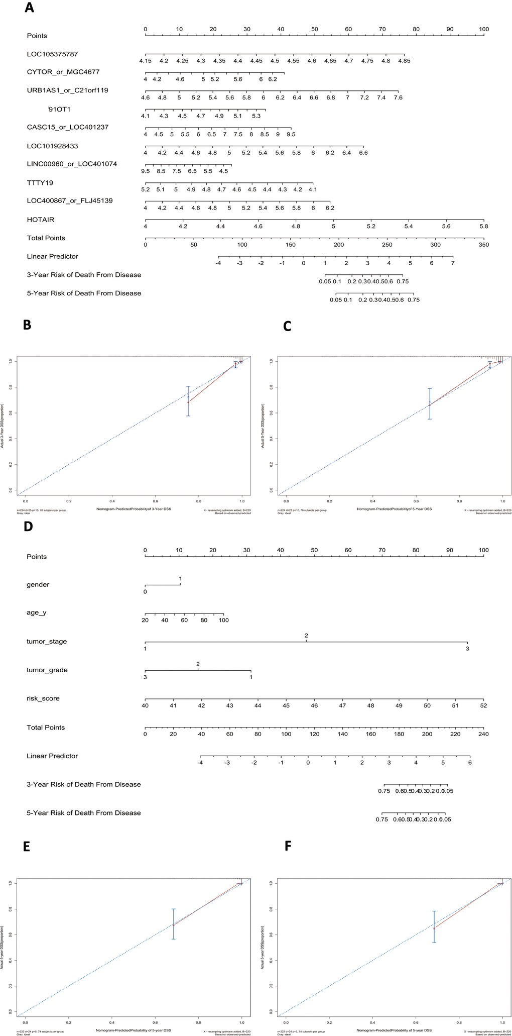 Using this formula, we calculated the risk score for each patient (Supplementary Tables 6–9). Defining the median risk score as a cut-off, the patients in the three series were divided into a high-risk subgroup or a low-risk subgroup of the same sample size (N=112, N=66, and N=83 and N=112, N=65, and N=82). Two prognostic nomograms for BLCA patients were successfully constructed to provide a clinically applicable quantitative approach for individual DSS prediction based on the signature and clinical prognostic factors, such as age, sex, grade and T stage (Figure 2A, 2D). The calibration curves in Figure 2B, 2C show a narrow margin between the predicted 3- and 5-year DSS rates and the actual values. The calibration plots in Figure 2E, 2F show excellent agreement between the predicted 3- and 5-year DSS rates and the actual observations. The C-index of the molecular nomogram was 0.88 (95% confidence interval (CI)=0.86-0.91) in GSE32894, 0.77 (95% CI=0.72-0.82) in GSE32548, and 0.73 (95% CI=0.68-0.77) in GSE13507. The C-index of the prognostic model combining the molecular signature with clinical risk factors was as high as 0.94 (95% CI=0.0.93-0.96) in GSE32894, 0.78 (95% CI=0.71-0.85) in GSE32548, and 0.90 (95% CI=0.87-0.91) in GSE13507. The condition number (K value) of the 10-lncRNA signature was calculated in every dataset which confirmed that there was no collinearity among these 10 genes (Supplementary Table 12). These results implied a superior predictive ability of the model, whether based on the 10-lncRNA signature alone or the signature combined with clinical parameters (Figure 3).