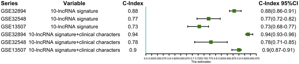 In all three independent series, the 10-lncRNA signature demonstrated a discriminatory ability for predicting DSS, with AUC values of 0.871 (95% CI=0.808–0.934) in GSE32894 (Figure 8A), 0.752 (95% CI=0.624–0.879) in GSE32548 (Figure 8B) and 0.707 (95% CI=0.597–0.816) in GSE13507 (Figure 8C). As shown by our data, this 10-lncRNA signature had robust sensitivity and specificity to potentially become a superior prognostic biomarker.