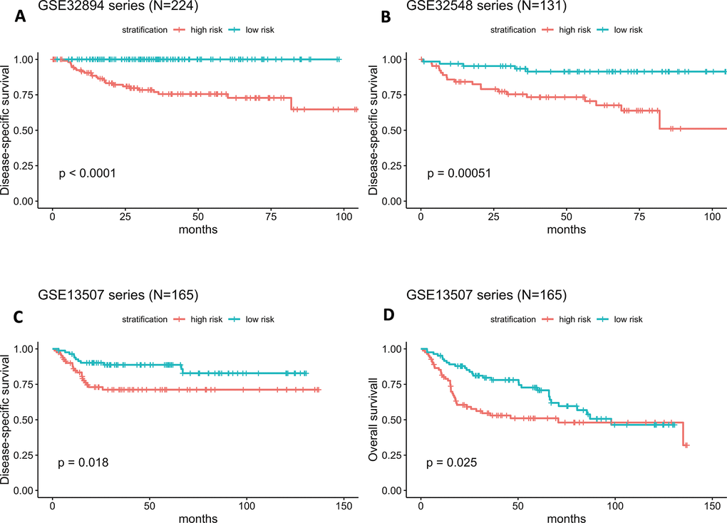 As illustrated in Figure 4A, the Kaplan-Meier analysis of GSE32894 showed that patients with higher risk scores had shorter DSS times than those with lower risk scores (log-rank test P < 0.0001). To further confirm the predictive value of this prognostic model, Kaplan-Meier analyses were performed to validate our signature in two independent external series, GSE32548 and GSE13507. An identical conclusion was obtained in GSE32548, where patients with high risk scores had significantly shorter DSS times than patients in the low-risk group (log-rank test P=0.00051) (Figure 4B). Similarly, in GSE13507, shorter DSS times were observed in the high-risk subgroup (log-rank test P=0.018) (Figure 4C). Even using overall survival (OS) as the follow-up endpoint, the risk score still separated patients with different survival times in the GSE13507 validation series (log-rank test P=0.025) (Figure 4D).