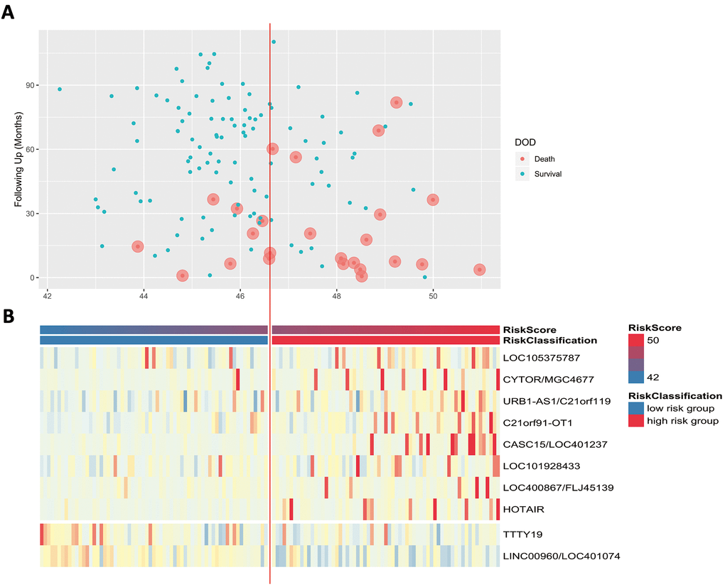 Scatter plots and heatmaps in GSE32548 were used to show the relationships among the risk score, the expression levels of ten lncRNAs and death from bladder cancer. Figure 5A shows that patients with higher risk scores tended to have higher mortality. The expression patterns of BLCA-specific lncRNAs were visualized in the heatmaps shown in Figure 5B. Patients with higher risk scores were observed to be more likely to have higher expression levels of risk-related lncRNAs, such as LOC105375787, CYTOR, URB1-AS1, C21orf91-OT1, CASC15, LOC101928433, FLJ45139, and HOTAIR. In contrast, patients with lower risk scores were more likely to have higher expression levels of suppressor lncRNAs (LINC00960 and TTTY19).