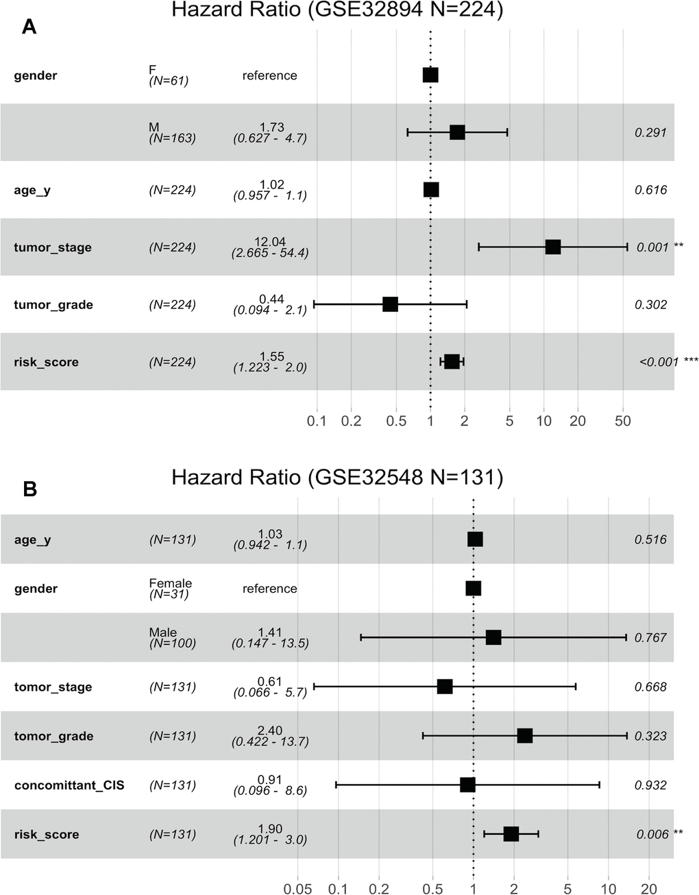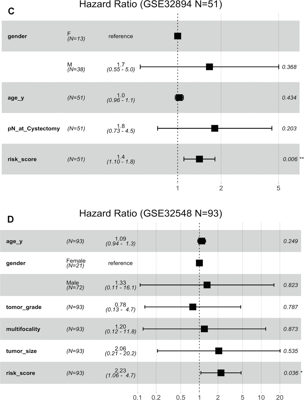 (C) Risk score is dependent of sex, age and pN in patients with cystectomy in GSE32894. (D) Risk score is dependent on sex, age, histopathological grade, multifocality and tumour size in patients with NMIBC in GSE32548.