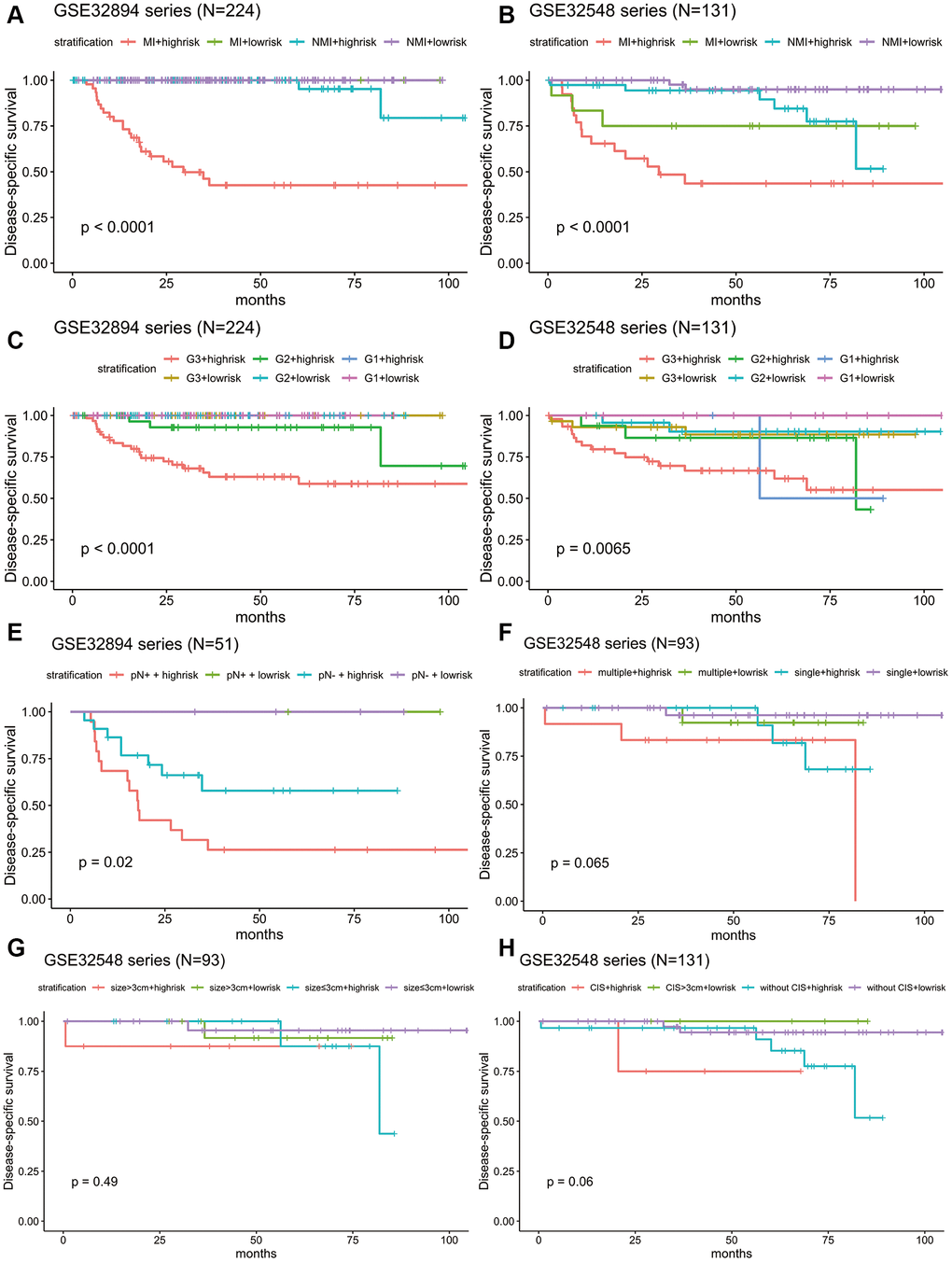 Stratification analysis was used to investigate whether the signature could discriminate patients with different prognoses irrespective of the same tumour stage. After stratifying the patients from GSE32894 and GSE32548 into the muscle invasion (≥T2) subgroup or non-muscle invasion (Ta or T1) subgroup, Kaplan-Meier plots showed that for patients in the same tumour invasion subgroup, those with higher risk scores had significantly shorter DSS times than those with lower risk scores (Figure 7A, 7B).