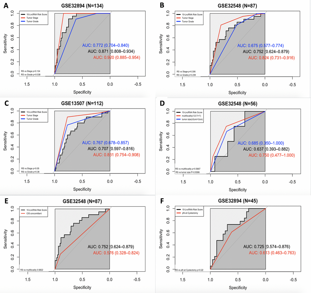 ROC curves were also calculated for the 10-lncRNA risk score, concomitant CIS, lymphovascular invasion, multifocality and tumour size. Compared with tumour multifocality and tumour size, as presented in Figure 8D, the AUC of the 10-lncRNA risk score was roughly the same (0.637 versus 0.750; 0.637 versus 0.685, 95% CI=0.393–0.882, P=0.5667; P=0.9366). As shown in Figure 8E, the AUC of the 10-lncRNA risk score was estimated to be greater than 0.70 in GSE32548, which was larger than that of concomitant CIS despite P>0.05 (0.752 versus 0.576, 95% CI=0.624–0.879, P=0.5822). Compared with lymphovascular invasion, as shown in Figure 8F, the 10-lncRNA risk score performed as a relatively good predictor and had a larger AUC (0.725 versus 0.613, 95% CI=0.574–0.876 P=0.22), albeit with no significance observed.