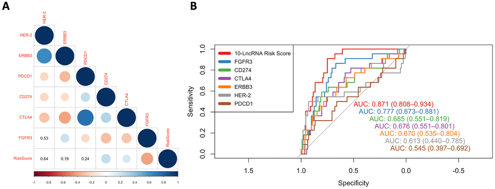 Interestingly, several previous studies similarly reported that some of these noncoding RNAs were involved in the regulation of the immune response. For example, Wang C et al. reported that CYTOR can enable B cell growth and transformation, which is consistent with our result that B cells showed significant infiltration in high-risk individuals [43]. Li SS et al. found C21orf91-OT1 to be dominated by functional processes of the immune response [27]. Yin Y et al. reported that CASC15 could epigenetically silence the expression of the immunomodulatory molecule programmed cell death 4 (PDCD4) and facilitate proliferation and invasion in melanoma cells [44]. To determine the prominent prognostic value of this immune-related-lncRNA, ROC curves were used to compare the AUC values of the risk score, immune checkpoints (PD-1, PD-L1 and CTLA4) and potential therapeutic targets (HER-2, ERBB3 and FGFR3). The results showed that our immune-related-signature did have a higher predictive performance than all the other signatures that were reported to have the potential to serve as predictors of BLCA survival [45–49].