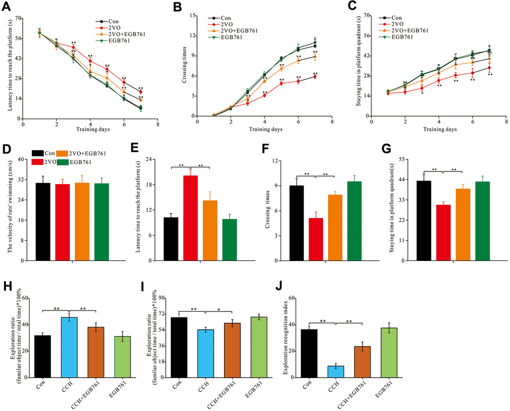 To further validate the cognitive improvements after CCH following EGB761 treatment, the NOR test was used to examine the spatial cognitive function. For NOR test, 2VO group had the higher ratio of familiar objects exploration than control group and 2VO+EGB761 group (P < 0.01) (Figure 1H). Accordingly, the 2VO group had less exploration ratio of novel objects than control group, but 2VO+EGB761 had higher exploration ratio than 2VO group (P < 0.01) (Figure 1I). Finally, 2VO group had the lower exploration recognition index (ERI) than control group, but 2VO+EGB group had the higher ERI than 2VO group (P < 0.01) (Figure 1J).