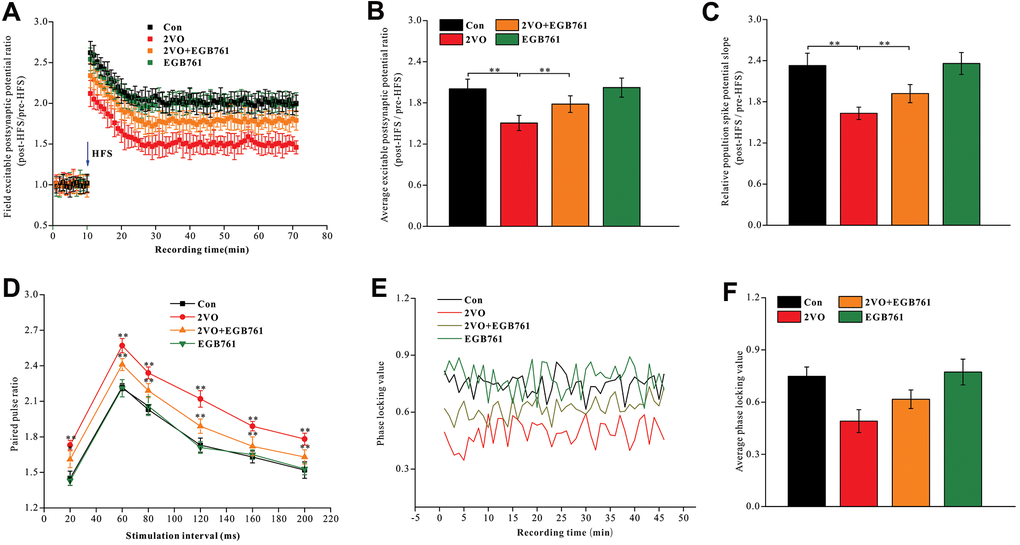 The neural circuit synchronization between the entorhinal cortex and CA1 was closely related to the cognitive function. The neural signals were simultaneously recorded in CA1 and the entorhinal cortex and they were transformed with the Hilbert transform function. The phase of neural signals was extracted, and the locking phase values were calculated (Figure 2E). The data showed that 2VO group had significantly lower PLV (P < 0.01), but 2VO+EGB761 group had higher PLV than 2VO group (P < 0.01) (Figure 2F).