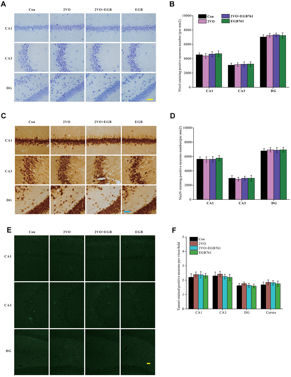 To identify the mechanisms underlying cognitive dysfunction occurring after CCH, the brain slices (5 μm) were stained with Nissl solution and anti-NeuN antibody (30-μm slice) to detect the number of alterations within the hippocampal neurons. Images of Nissl-stained and anti-NeuN-labeled neurons showed that there are no differences for the neuronal densities in the different sub-regions of the hippocampus among the control group, 2VO and 2VO+EGB761 groups (P > 0.01) (Figure 3A, 3D). These observations suggested that CCH and EGB761 did not change the neuronal number of hippocampus. Although the neuronal number remained unchanged, it was possible that the neurons were about to die. To determine whether neuronal apoptosis due to CCH worsened cognition, TUNEL staining was performed to detect neuronal apoptosis. The dUDP-stained neurons showed no significant aggravation in apoptosis (Figure 3E, 3F), which suggested that the hippocampal neurons did not undergo apoptosis after CCH, and that cognitive impairment could be functional or structural.