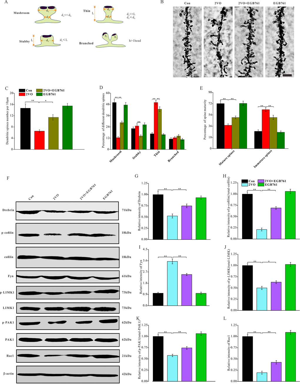 Our present study demonstrated that CCH could induce a decreased proportion of mushroom dendritic spines and mature spines; however, EGB761 could prevent this decrease. Synaptic plasticity includes functional plasticity and structural plasticity. The structural plasticity of synapses is mainly manifested by the dynamic changes in the morphological state of dendritic spines [28]. Generally, the dendritic spines have four morphological states: mushroom, stubby, thin, and branched spines (Figure 5A). The mushroom and stubby forms, which are the mature dendritic spines, can form stable and functional synapses with other spines; however, the thin and branched dendritic spines cannot because they are immature [29]. Cognitive dysfunction occurs when the dendritic spines of hippocampus degenerate [30]. This observation suggests that EGB761 may attenuate CCH-induced spatial cognitive dysfunction by preventing the deterioration of synaptic structural plasticity. Our present findings showed that CCH induced the downregulation of drebrin and the dephosphorylation of cofilin, with corresponding changes in their upstream regulator pathway, while EGB761 treatment prevented these effects. The polymerization of F-actin regulates the shape of dendritic spines. Drebrin in dendritic spines, an actin-binding protein, can function in maintaining the shape of the spine by regulating the formation of stable F-actin. When drebrin level decreases, the dendritic spines may shrink, deform, and even degenerate [31]. Cofilin is another actin-binding protein; when cofilin is activated by dephosphorylation, the cofilin-actin filaments are stably bundled; this sequestration of cofilin by actin causes synaptic dysfunction, damages the normal actin dynamics, and blocking axonal or dendritic transportation [32]. Therefore, these results suggest that EGB761 may increase the expression of drebrin protein and partially inactivate cofilin to prevent dendritic spine degeneration after CCH.