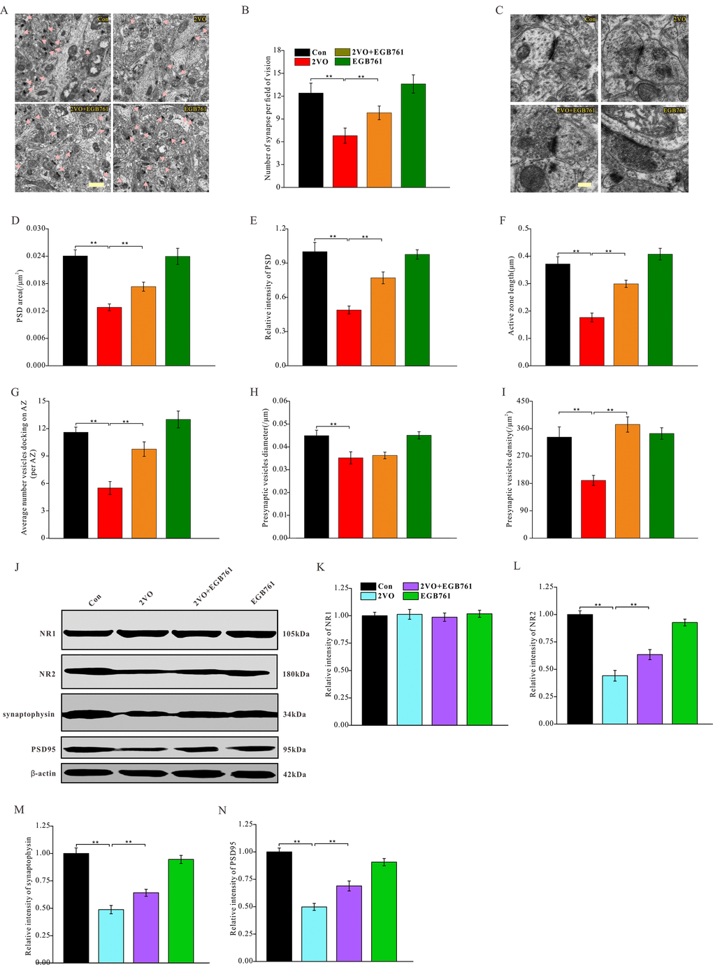 Synaptic proteins are the fundamental components of synaptic structures. To identify the mechanisms underlying synaptic structure changes, several synaptic proteins of hippocampus were investigated after CCH (Figure 6J). The data demonstrated that 2VO group had noticeably downregulated NR2, synaptophysin, and PSD95, whereas 2VO+EGB761 group had more these synaptic proteins than 2VO group (P<0.01) (Figure 6L–6N). However, in all the groups, no change was observed in the expression levels of NR1 (Figure 6K). These findings suggested that CCH could induce the downregulation of synaptic proteins to deteriorate synaptic structures, but that EGB761 could prevent this downregulation to ameliorate the degeneration of synaptic structures.