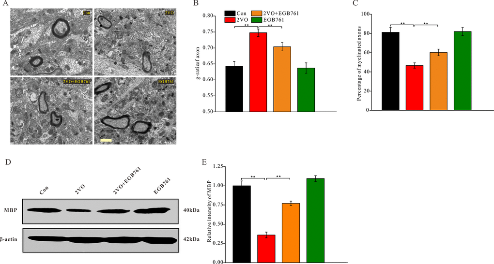 Axon demyelination might impair cognition by reducing the transmission velocity of neural signals. The alterations in axon myelination after CCH were investigated with a TEM (Figure 7A). The axon myelination analysis showed that 2VO group had the higher g-ratio, but 2VO+EGB761 group demonstrated lower g-ratio than 2VO group (P < 0.01) (Figure 7B). The lower percentage of myelinated axons in 2VO group was less over control group, but 2VO+EGB761 group exhibited higher percentage of myelinated axons than 2VO group (P < 0.01) (Figure 7C). These implied that CCH induced axon demyelination, and that EGB761 treatment could prevent it. Myelin basic protein (MBP) is the main constituent protein of the myelin sheath of CNS. To further validate axon demyelination, MBP protein level was detected with western blotting (Figure 7D). 2VO group had less MBP protein level than control group, but 2VO+EGB761 group had more MBP protein than 2VO group (P < 0.01) (Figure 7E). These findings further clarified that EGB761 could prevent CCH-induced axon demyelination.