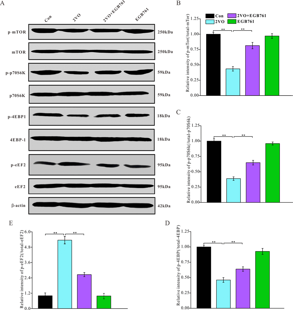 2VO made several proteins decrease, including Arc, c-Fos, NR2, synaptophysin, PSD95, drebrin, and MBP. For regulating protein synthesis, the mTOR signaling pathway plays the very important role. To investigate the mechanisms regulating the downregulation of these proteins, the expression of mTOR signaling pathway molecules were detected with western blotting (Figure 8A). 2VO group had less p-mTOR, p-p70S6K and p-4EBP1 levels, but 2VO+EGB761 group manifested the higher levels of these proteins than 2VO group (P < 0.01) (Figure 8B–8D). 2VO group showed higher p-eEF2 level, but 2VO+EGB761 group had lower p-eEF2 level than 2VO group (P < 0.01) (Figure 8E). The activated mTOR could phosphorylate p70S6K, and the activated p-p70S6K could further phosphorylate 4EBP1. The phosphorylated 4EBP1 dissociates from the eukaryotic translation initiation factor 4E, which then facilitates protein translation. Hence, it can be speculated that CCH could induce the inhibition of protein synthesis, and that EGB761 treatment could reverse this inhibition.
