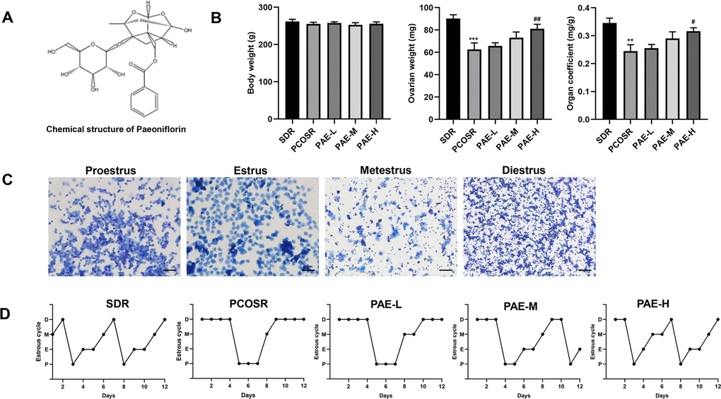 To explore the effect of PAE on PCOS development, the body weight and ovary weight in PCOS rats were monitored. We found that there was no statistically significant difference on the body weights in the five groups. In comparison with SDR group, the ovary weight and the organ coefficient of the PCOSR group were markedly reduced. The treatment of high-dose PAE (Figure 1A) could significantly block the DHEA-induced decline of ovary weight and organ coefficient (P < 0.05) (Figure 1B). These data suggested that PAE had potential therapeutic effect on PCOS.