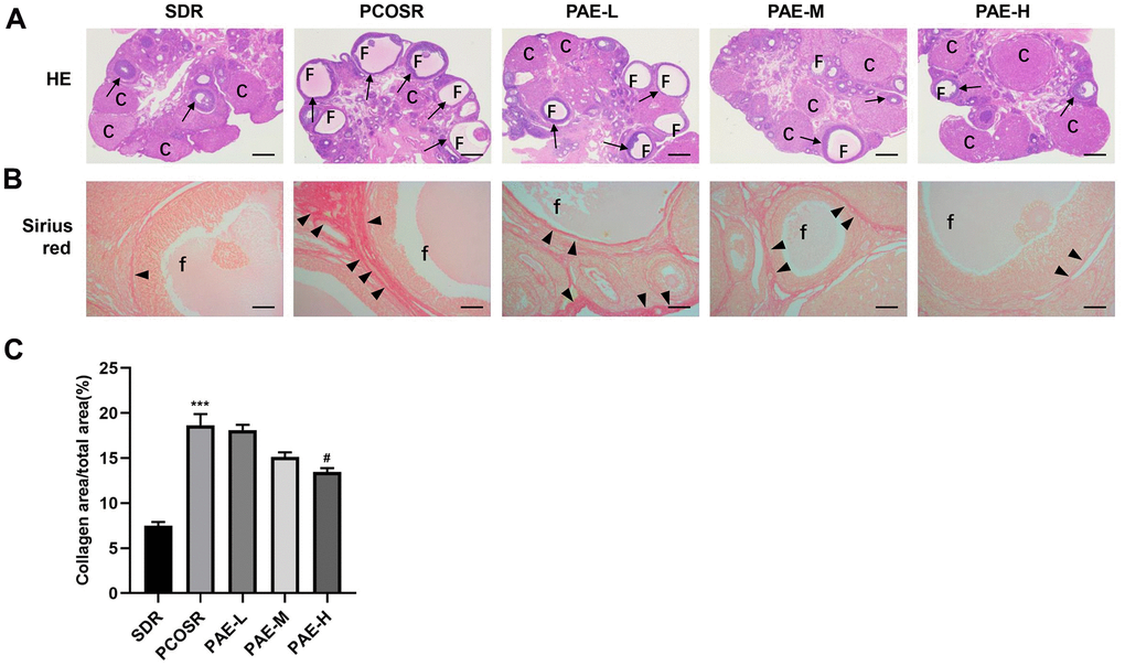 Sirius red staining (Figure 2B) revealed that only a few collagen fibers were present in the ovarian tissues in SDR group. In contrast, more collagen fibers were clearly observed in PCOSR group. Treatment with high-dose PAE markedly reduced ovarian fibrosis (P < 0.05), which indicated that PAE improved ovarian fibrosis and collagen deposition caused by DHEA. The analysis of the collagen areas also presented that PAE markedly reduced the collagen areas (Figure 2C).