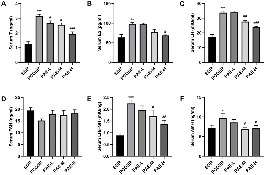To further study the effect of PAE on PCOS development, the ovary structure was analyzed by H&E staining. In SDR group, multiple corpus luteum and follicles in different stages were observed from ovarian tissue slices by the microscope, and cystic dilated follicles were rarely found. Whereas in PCOSR group, the ovaries showed polycystic changes with cystic dilated follicles. The number of corpus luteum was significantly reduced, and the granular cell layer in the follicles was also reduced compared with SDR group. The above pathological changes could be effectively improved after the treatment with PAE. Compared with PCOSR group, the number of cystic dilated follicles in the ovarian was tissues decreased, while the number of corpus luteum was increased, and the granular cell layers were thickened in the ovaries in PAE-M and PAE-H groups. The improvement was most obvious in the PAE-H group (Figure 2A). These results indicated that PAE ameliorated the pathological symptoms of the ovary.