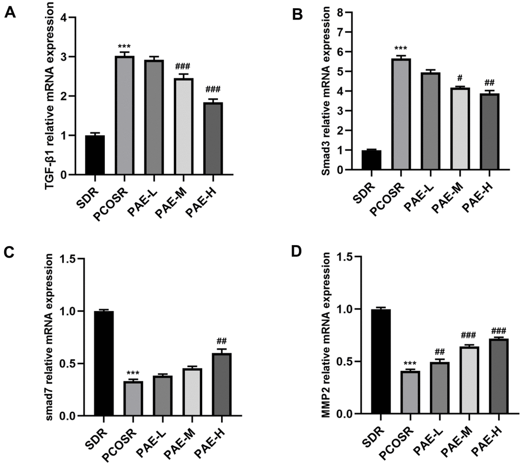 To investigate the specific mechanism underlying the effect of PAE on PCOS development, the TGF-β1/Smads signaling pathway was determined via qRT-PCR and western blot. The mRNA expression levels of TGF-β1 and Smad3 in the ovarian tissues of PCOSR group were significantly higher than those in SDR group (P < 0.001), and the mRNA expression levels of Smad7 and MMP2 in the ovarian tissues of PCOSR group were significantly lower than those in SDR group (P < 0.001). Treatment with PAE reduced the relative mRNA levels of TGF-β1 and Smad3 (P < 0.05) and increased the mRNA levels of Smad7 and MMP2 (P < 0.05) (Figure 4A–4D).
