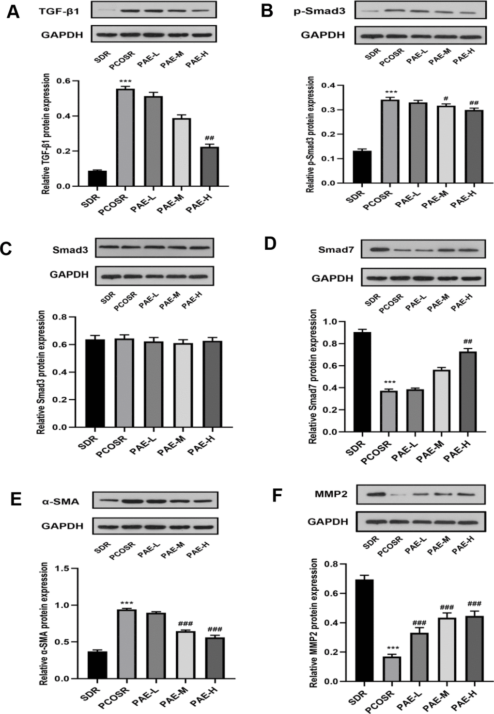 The protein expression levels of TGF-β1, p-Smad3 and α-SMA in the ovarian tissues of PCOSR group were significantly higher than those in the SDR group(P < 0.001), and the protein expression levels of Smad7 and MMP2 in the ovarian tissues of PCOSR group were significantly lower than those in SDR group (P < 0.001). There was no statistically significant difference in the protein expression level of Smad3. Treatment with PAE corrected the reduction in protein expression levels of Smad7 and MMP2 (P < 0.05), and reduced the protein expression levels of TGF-β1, p-Smad3 and α-SMA (P < 0.05) (Figure 5A–5F). These results suggested that PAE attenuated DHEA-induced polycystic ovary syndrome via inhibiting TGF-β1/Smads signaling pathway in PCOS rats.