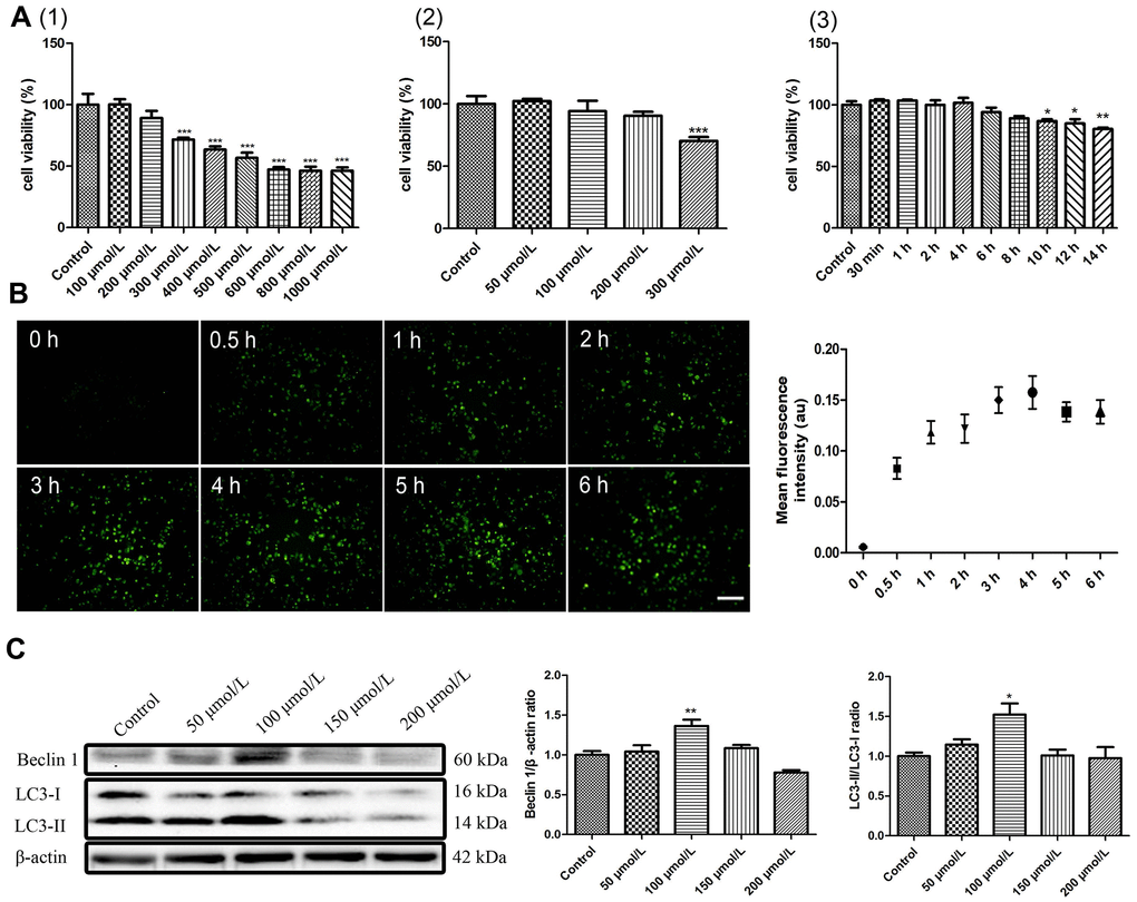 MDC (Sigma-Aldrich) was used to observe autophagic vacuoles. After different treatments, cells were incubated with 50 μmol/mL MDC dye in dark for 30 min at 37° C. After washing with PBS, the cells were observed under a fluorescence microscope (IX-71, Olympus).