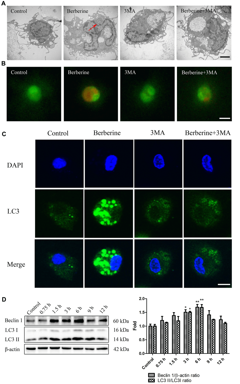 Based on these results, we conclude that berberine induced autophagy earlier (6 h) than apoptosis (10 h) in peritoneal macrophages. Treatment with 3MA reduced berberine-induced autophagy and promoted berberine-induced apoptosis.