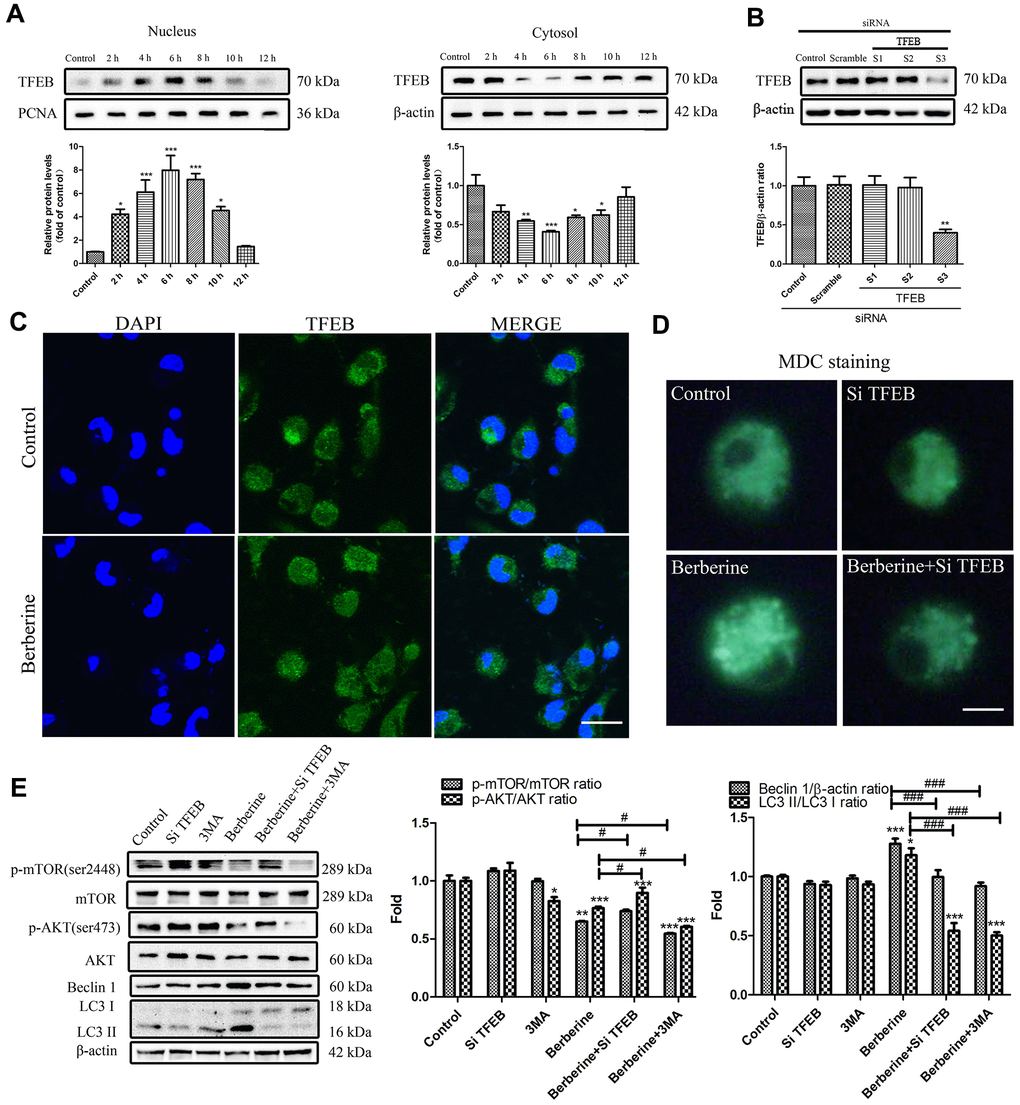 TFEB, a recently discovered transcription factor, controls the expression of genes involved in the formation of autophagic lysosomes, and the synthesis of lysosomal-related autophagy pathways. To study the crosstalk between TFEB and berberine-induced autophagy, we checked TFEB protein level in whole cell lysate and the effect of berberine to phosphorylation level of TFEB. Then we explored the expression of TFEB in both nucleus and cytosol following berberine treatment for different time intervals. We found that With the increase of berberine incubation time, the expression of TFEB in the whole cell did not change, but the phosphorylation level of TFEB decreased gradually at 0-6 hours, peaked at 6h, and gradually recovered after that (Supplementary Figure 3). Cell fractionation data showed that berberine induced the translocation of TFEB to the nucleus, with maximum translocation occurring at 6 h. The cytosolic TFEB levels recovered after 6 h (Figure 3A). Immunofluorescence data supported these results, which showed that TFEB was localized to the nucleus in the berberine group (Figure 3C). To further study the relationship between TFEB and autophagy, we knocked down TFEB by siRNA (siTFEB) (Figure 3B). Next, peritoneal macrophages were treated with berberine and with or without siTFEB, and the expression of autophagy-related proteins was assessed by western blotting. The results revealed that knocked down TFEB promoted the phosphorylation of AKT and mTOR and suppressed the expression of Beclin 1 and LC3 II/LC3 I (Figure 3E). To further study the effect of TFEB on autophagosomes following berberine treatment, we stained the cells with monodansylcadaverine (MDC), a fluorescent marker for autophagic vacuoles. The silencing of TFEB reduced the number of bright green vesicles observed in the berberine group (Figure 3D).