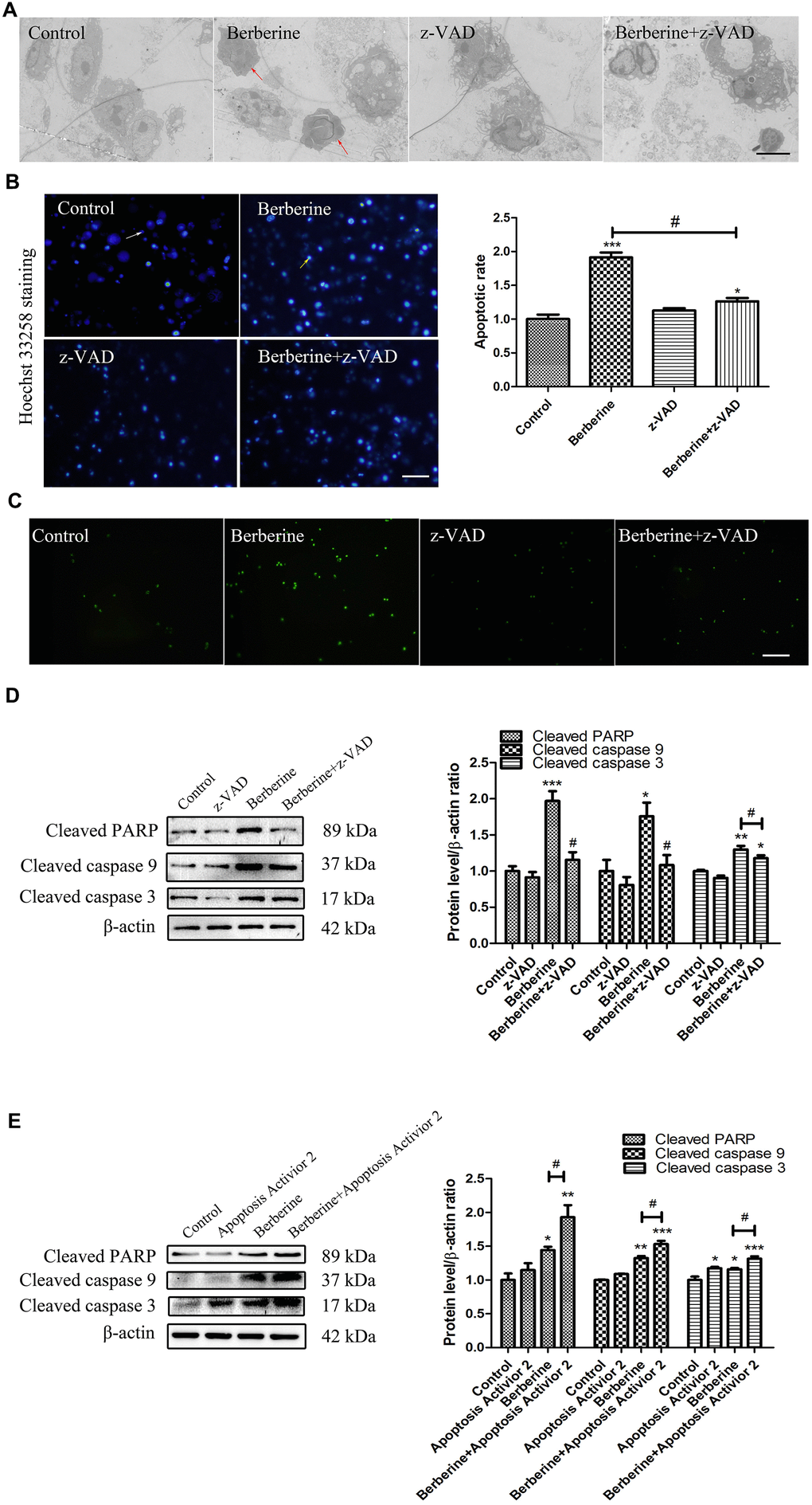 We next examined the occurrence of apoptosis in macrophages treated with 100 μmol/L berberine for 10 h. Compared with the control group, the expression of apoptosis-related proteins, namely cleaved caspase 9, cleaved caspase 3, and cleaved PARP increased in berberine-treated cells. However, pre-treatment of cells with an apoptosis inhibitor z-VAD reversed this increase (Figure 4D). On the contrary, pre-treatment with Apoptosis Activator 2 enhanced the expression of apoptotic proteins induced by berberine (Figure 4E). TEM revealed ultrastructural changes, including typical apoptotic chromatin condensation on the interior surface of the nuclear envelope in macrophages treated with berberine for 10 h (Figure 4A). The number of Hoechst 33258-stained cells (blue) was higher in the berberine group than in the control group. Similarly, terminal deoxynucleotidyl transferase dUTP nick end labeling (TUNEL) staining revealed a higher number of bright green TUNEL-positive cells in the berberine group than in the control group. Pre-treatment of cultured macrophages with z-VAD reduced the number of apoptotic cells (Figure 4B, 4C). These results indicated that berberine induced macrophage apoptosis after 10 h.