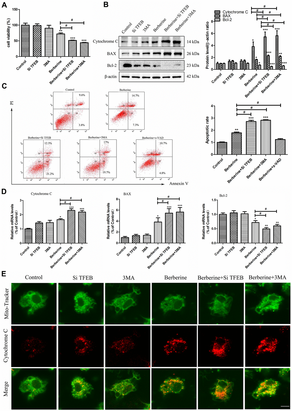 Macrophage apoptosis in advanced plaques contributes to the pathogenesis of atherosclerosis by destabilizing the plaques. Thus, preventing macrophage apoptosis could be a therapeutic strategy. To explore the relationship between TFEB nuclear translocation and apoptosis following berberine treatment in peritoneal macrophages, we checked the cell viability using the CCK-8 assay. Compared with the cells in the berberine only group, TFEB silencing reduced the cell viability (Figure 5A). To further assess the effect of TFEB nuclear translocation on apoptosis, the expression of apoptotic proteins was detected by western blotting. Compared with the berberine group, the expression of pro-apoptotic factor BAX and apoptosis-related proteins, such as cytochrome C, increased following pre-treatment with siTFEB, whereas that of anti-apoptotic factor Bcl-2 decreased (Figure 5B). Similar results were observed for the mRNA levels of these proteins (Figure 5D). Pre-treatment with siTFEB increased the accumulation of berberine-induced apoptotic cells (Figure 5C). Further, immunofluorescence data revealed that pre-treatment with siTFEB promoted the berberine-induced release of cytochrome C (Figure 5E).