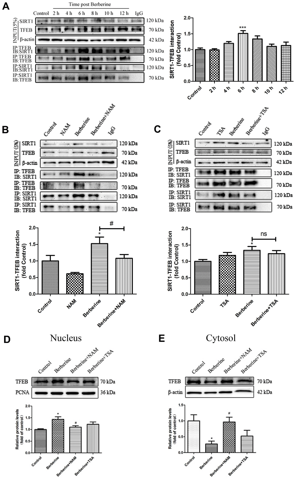 We next studied the effect of berberine on the relationship between SIRT1 and TFEB. We observed that following the incubation with berberine, SIRT1 gradually bound to TFEB in peritoneal primary macrophages in a time-dependent manner, with maximum binding occurring at 6 h (Figure 6A). The formation of berberine-induced SIRT1/TFEB complex was inhibited after treatment with nicotinamide (NAM), a SIRT1 inhibitor. However, the addition of protease inhibitor trichostatin A (TSA) did not affect the formation of the SIRT1/TFEB complex (Figure 6B, 6C). Moreover, NAM inhibited berberine-induced TFEB nuclear translocation, whereas the addition of TSA did not affect the TFEB nuclear translocation (Figure 6D, 6E). These results confirmed that berberine promoted the formation of SIRT1/TFEB complex by inducing TFEB nuclear translocation.