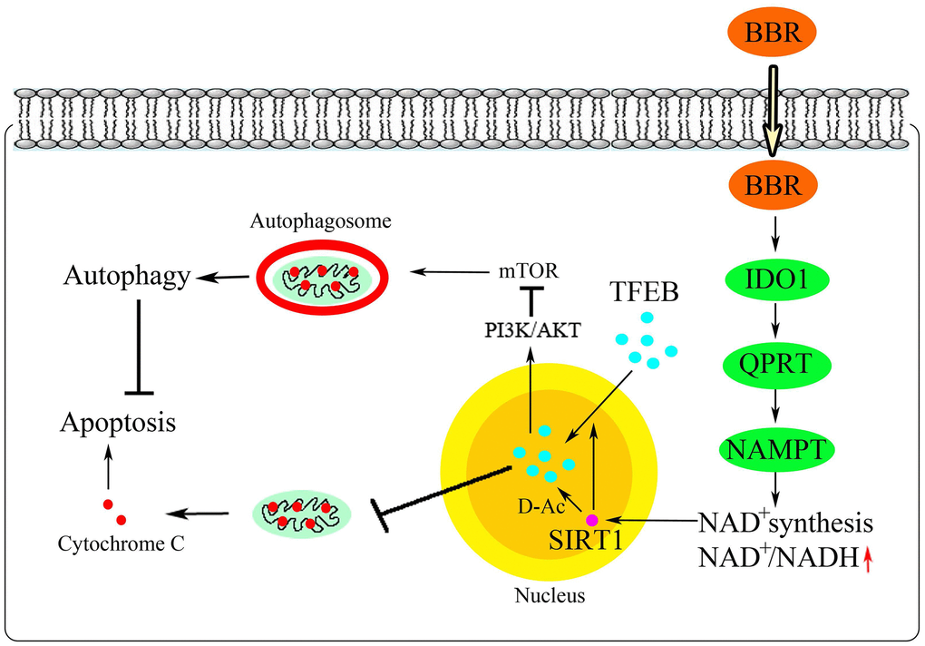 In summary, berberine activated SIRT1 through the NAD+ synthesis pathway to promote TFEB nuclear translocation, form SIRT1–TFEB immune complex, and deacetylate TFEB. These events subsequently triggered autophagy in peritoneal macrophages and inhibited apoptosis (Figure 9). Our data provide a new possibility for the treatment of atherosclerosis using berberine.