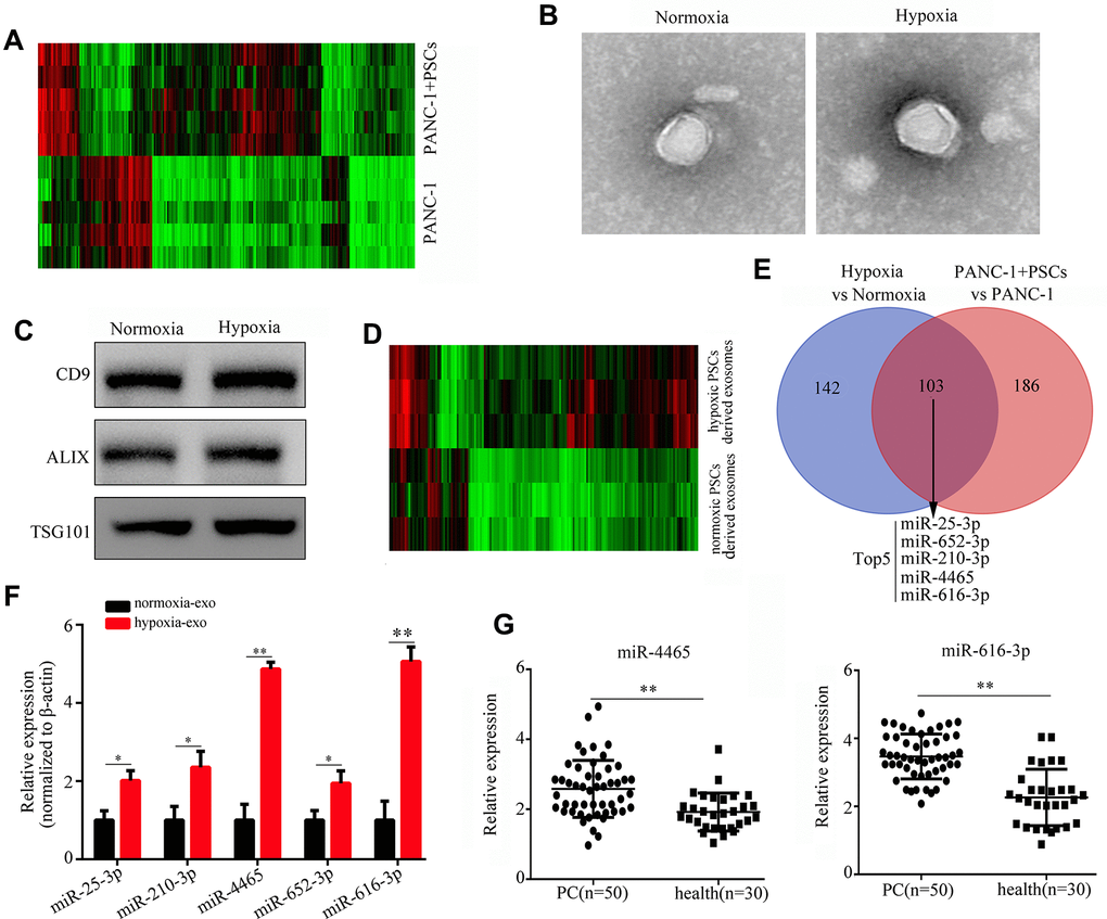 Next, the corresponding in vivo (plasma-derived) and in vitro miRNA profiles were compared to identify common transcripts differentially expressed among conditions. A total 103 specific hypoxic PSCs-derived exosomal miRNAs were shown to overlap with those registered in plasma exosomes. Among these, miR-25-3p, miR-625-3p, miR-210-3p, miR-4465, and miR-616-3p showed the greatest differential expression (Figure 1E). We further used qRT-PCR to detect the expression of these miRNAs in exosomes from PSCs cultured under normoxia and hypoxia. Results showed that the expression of both miR-4465 and miR-616-3p increased most significantly (>3 fold) after hypoxic exposure (Figure 1F). Moreover, we found that the expression of miR-4465 and miR-616-3p was significantly increased in plasma exosomes from PC patients (n=50), compared with healthy individuals (n=30) (Figure 1G).