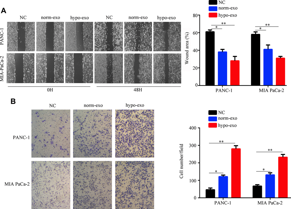 We next tested whether PSC-derived exosomes can deliver miR-4465 and miR-616-3p to PC cells. Results showed that exposure to both normoxic and hypoxic PSC-derived exosomes increased the expression of miR-4465 and miR-616-3p in both PANC-1 and MIA PaCa-2 PC cells; however, for both miRNAs the upregulation was stronger in cells incubated with exosomes derived from hypoxic PSCs (Figure 2A). Next, the CCK-8 assay was used to detect the effect of PSC-derived exosomes on the proliferation of PC cells. Results showed that hypoxic PSC-derived exosomes significantly increased the proliferation of both PANC-1 and MIA PaCa-2 cells, compared with cultures treated with either normoxic PSC-derived exosomes or exosome-depleted medium, used as negative control (Figure 2B). Furthermore, both wound healing and Transwell assays revealed that treatment with hypoxic PSC-derived exosomes significantly enhanced migration and invasion in both cell lines (Figure 3A, 3B).