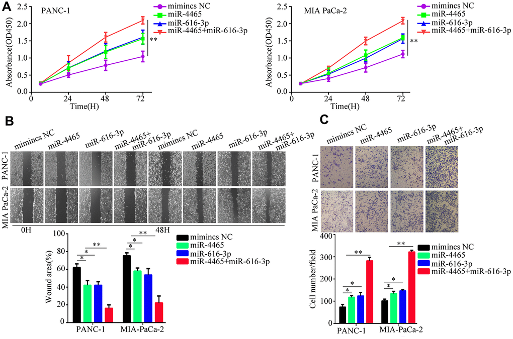 Despite therapeutic advances, early metastasis and late tumor detection contribute to the extremely poor prognosis of patients with PC [16]. Hypoxia is a critical factor promoting communication between PC and stromal cells in the tumor microenvironment [17, 18]. On the other hand, mounting evidence suggests that exosomal miRNAs derived from PSCs are key mediators of PC progression and metastatic dissemination [8, 10]. Therefore, the present study examined the effects of hypoxia on the expression of miRNAs carried by PSC-derived exosomes and analyzed their impact on PC cell growth, migration, and invasion. We found that miR-4465 and miR-616-3p were the most upregulated miRNA transcripts within exosomes isolated from hypoxia-preconditioned PSCs. Importantly, we discovered also that both miRNAs were significantly overexpressed in plasma exosomes from patients with PC, compared with those of healthy individuals.