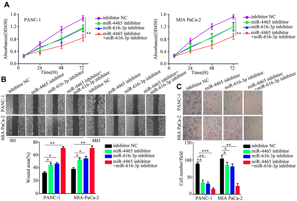 To confirm that the proliferation and migration/invasion potential of PC cells was indeed stimulated by an increase in intracellular miR-4465 and miR-616-3p levels, we evaluated these processes in PANC-1 and MIA PaCa-2 cells transfected with miR-4465 and/or miR-616-3p mimics. Results showed that each single miRNA mimic enhanced proliferation, migration, and invasion in both cell lines, while co-transfection with the two miRNA mimics further enhanced these effects (Figure 4A–4C). To further validate these findings, we transfected PC cells with miR-4465 and/or miR-616-3p inhibitors before treatment with hypoxic PSC-derived exosomes. While both inhibitors independently decreased the effect of hypoxic PSC-derived exosomes on PC cell proliferation, combined transfection resulted in a stronger effect (Figure 5A). In turn, pre-treatment of PC cells with miR-4465 and miR-616-3p inhibitors reversed the stimulation of migration and invasion exerted by hypoxic PSCs-derived exosomes, whereas a stronger repression was noted upon combining both inhibitors (Figure 5B, 5C).