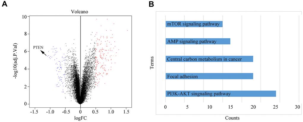 To explore the molecular mechanism by which hypoxic PSC-derived exosomal miR-4465 and miR-616-3p stimulate growth and migration in PC cells, we treated PANC-1 cells with normoxic and hypoxic PSC-derived exosomes and performed iTRAQ analysis to determine protein profiles. Results showed that upon treatment with hypoxic PSC-derived exosomes PTEN was the most significantly downregulated protein (Figure 6A). KEGG analysis showed that the differentially expressed proteins identified by iTRAQ analysis were significantly enriched in five signaling pathways, namely PI3K-AKT, mTOR, central carbon metabolism, cAMP, and focal adhesion (Figure 6B).