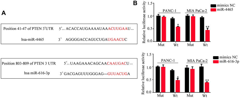 PTEN was predicted as a target of miR-4465 and miR-616-3p by TargetScan. PTEN plasmids containing wild type (Wt) or mutant (Mut) binding sites for miR-4465 or miR-616-3p were constructed and sub-cloned into the psiCHECK-2 vector (Promega, USA), which contains a constitutively expressed firefly luciferase gene. Control and miR-4465- or miR-616-3p- overexpressing PANC-1 and MIA PaCa-2 cells were then transfected with the above PTEN luciferase reporter vectors. Luciferase activity was measured using a Dual-Luciferase Reporter Assay System (Promega, USA).