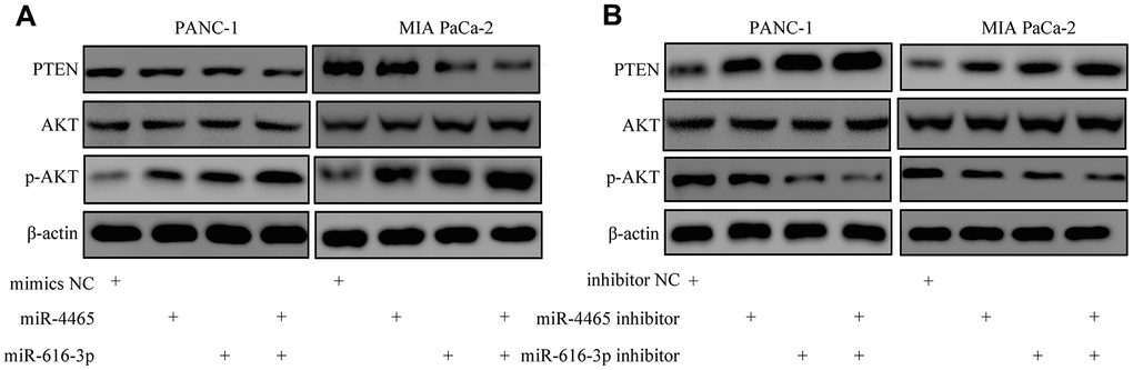 We then accessed TargetScan to identify putative mRNA targets of miR-4465 and miR-616-3p. Results showed that both miRNAs can bind PTEN mRNA (Figure 7A). To verify these interactions, we conducted dual-luciferase reporter assays. We found that overexpression of either miR-4465 or miR-616-3p significantly reduced the luciferase activity associated with the WT 3′-UTR of the PTEN transcript, whereas no significant reduction was observed in cells transfected with a mutant (MUT) 3′-UTR sequence (Figure 7B). Meanwhile, western blotting showed that transfection with miR-4465 or miR-616-3p mimics decreased the expression of PTEN and increased the expression of p-AKT, while the combination of both miRNA mimics potentiated these effects (Figure 8A). Subsequently, we used inhibitors of miR-4465 and miR-616-3p to treat PC cells prior to exposure to hypoxic PSC-derived exosomes. Western blot results demonstrated that both inhibitors were independently able to increase PTEN and reduce p-AKT expression, while their combination accentuated these effects (Figure 8B). Taken together, these results demonstrated that hypoxic PSC-derived exosomal miR-4465 and miR-616-3p target PTEN and activate the PTEN/AKT pathway.