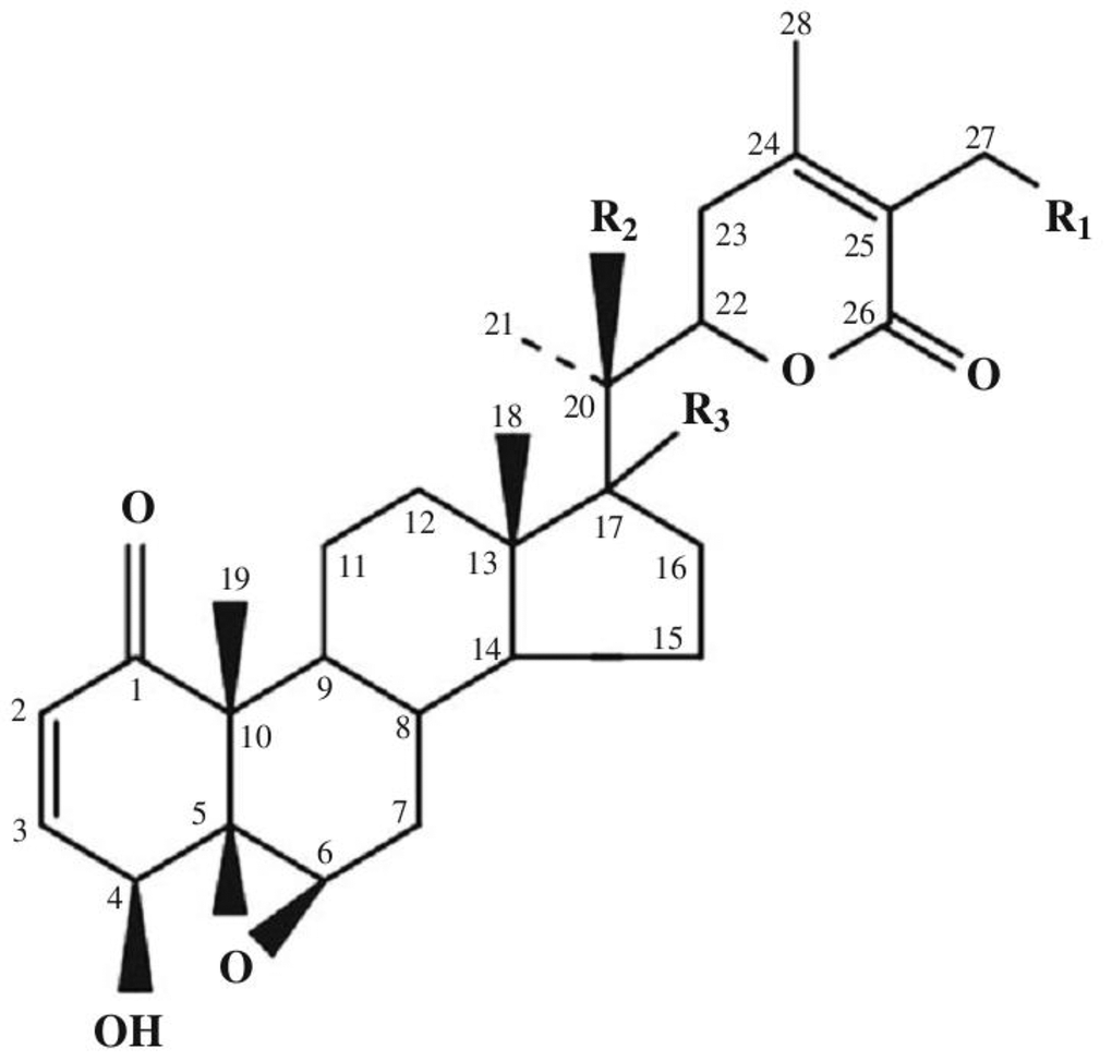 The term “withanolide” is commonly used for 22-hydroxyergostane-26-acid-22,26-olide [4]. Its structural diversity is due to the modifications of the carbocyclic backbone or side chain. The other typical substitutions and modifications of the naturally occurring metabolites are as follows [16]: oxo group at C-1; instead, less commonly a hydroxyl group; double bond C-2 -> C-3; instead, less often the hydroxyl group at C-3; delta-lactone (26 -> 22O), often unsaturated (24, 25); a fragment of gamma-lactone (26 -> 23O) instead of delta-lactone, often also unsaturated; lactol part instead of lactone residue; high oxidation state in many positions of the entire molecule (for example, oxo groups, hydroxyl groups, epoxy substructures, hemicetals); oxidative degradation and or new cyclization of the molecule.