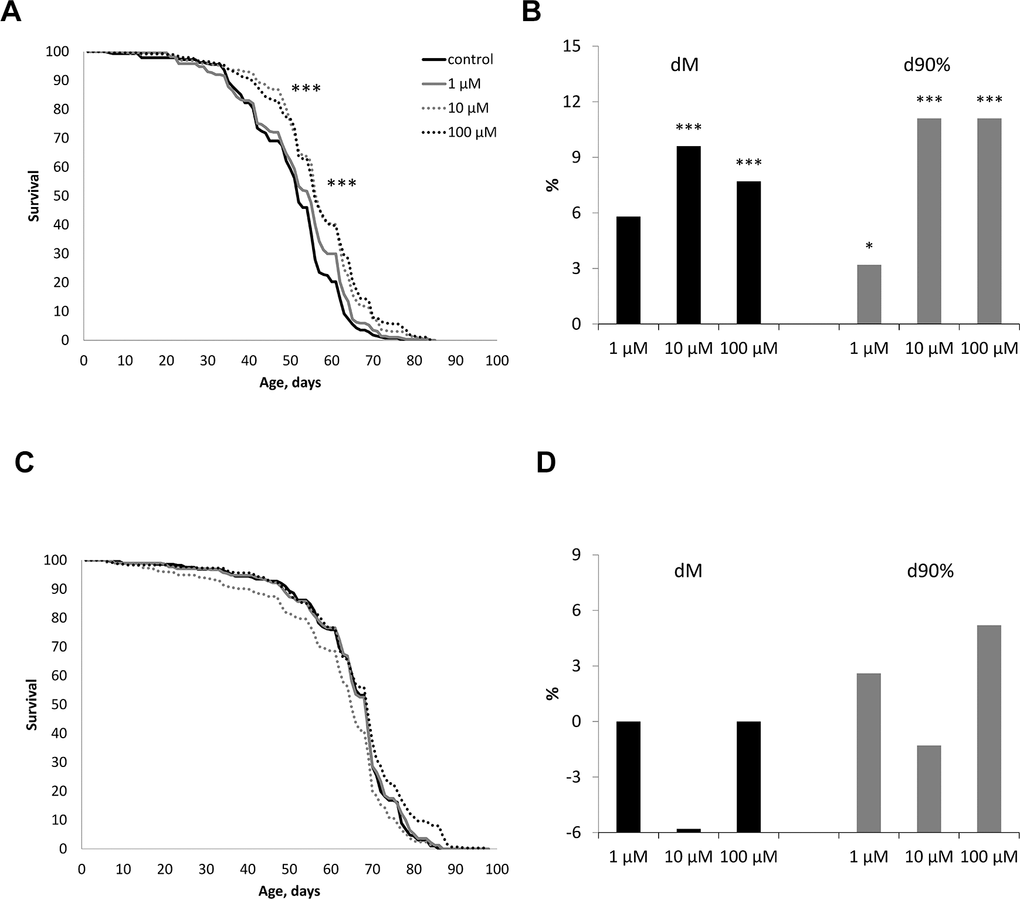 The effect of WA at concentrations of 1, 10, 100 μM on the life span of male and female Drosophila melanogaster of the wild type Canton-S was studied. WA at 10 and 100 μM concentrations increased the median life span in male by 7.7, 9.6% (respectively) (p<0.0001) and the maximum life span (the age of death 90% of individuals) by 11.1% both (Figure 2B). While we sighted significant shift of these group curves to the right relative to the control curve (Figure 2A). The 1 μM of WA treatment not affected on studied life span parameters. Also WA treatment not affected on studied lifespan parameters in Drosophila’s females (Figure 2C, 2D).