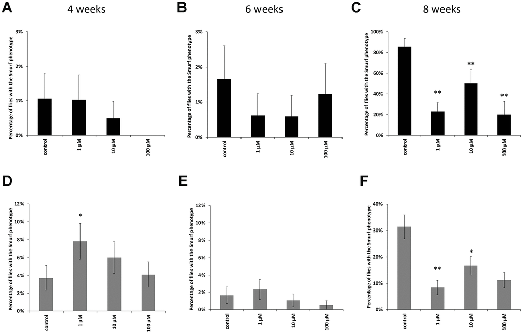 In males at the age of 8 weeks, a decrease in the proportion of flies with the «smurfs» phenotype by 67, 61 and 89% was observed relative to the control when taking WA at concentrations of 1, 10, 100 μM, respectively (Figure 3C). Females also showed a decrease in the «smurfs» rate only at the age of 8 weeks. The proportion of flies with the «smurfs» phenotype was lower by 73, 42 and 61 %% relative to the control after WA at 1, 10, 100 μM concentrations, respectively (Figure 3F). Other group of the experiment showed no significant differences (Figure 3A, 3B, 3D, 3E).