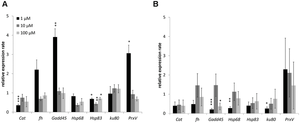 Changes in the expression of genes involved in antioxidant defense (catalase, Peroxiredoxin V), metal detoxification (frataxin), recognition of DNA damage (Gadd45), heat shock proteins (Hsp68, Hsp83), and repair of double-strand breaks (Ku80) studied. The combined results are presented in Figure 4 and considered. In males 1 μM WA effected on expression of Gadd45 (3.9-fold-increase), Hsp83 (1.5-fold-decrease) and PrxV (3.1-fold-increase) genes. The10 μM and 100 μM of WA decreased the expression of only Hsp68 (2.3-, 1.4-fold respectively) gene (Figure 4). In females the 1 μM of WA treatment decreased the expression of Gadd45 (4.9-fold), Hsp68 (3.6-fold), Ku80 (3.9-fold) genes. The100 μM WA treatment decreased the expression of only Gadd45 (2.7-fold) gene (Figure 4). The expression of other studied genes was not significantly changed.