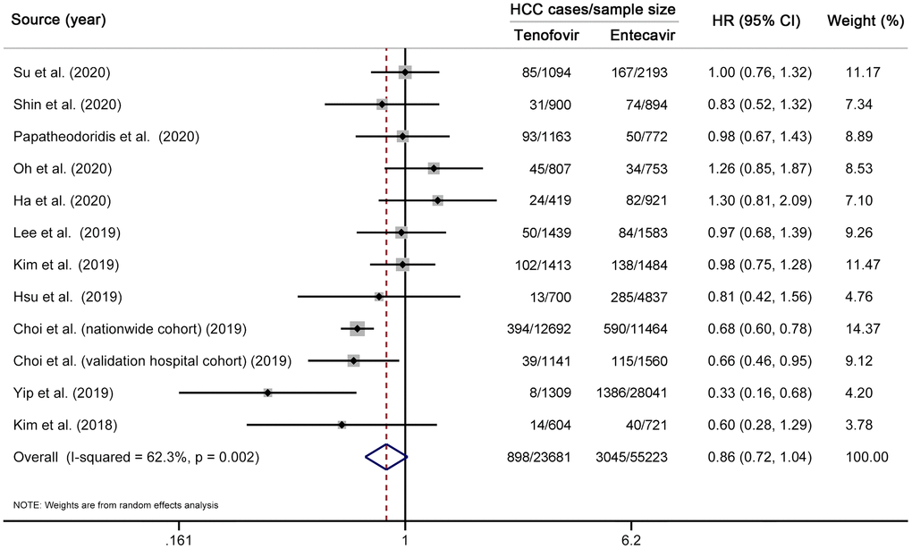 In conclusion, TDF is similar to entecavir in reducing HCC incidence among treatment-naïve patients with CHB. These findings support the current guidelines that both TDF and entecavir should be considered as first-line agents for CHB treatment. Heterogeneous results of included studies may result from their disparity in follow-up length. Given the inherent limitations of observational data and a small number of included studies, our findings should be treated with caution and need to be validated by future studies.