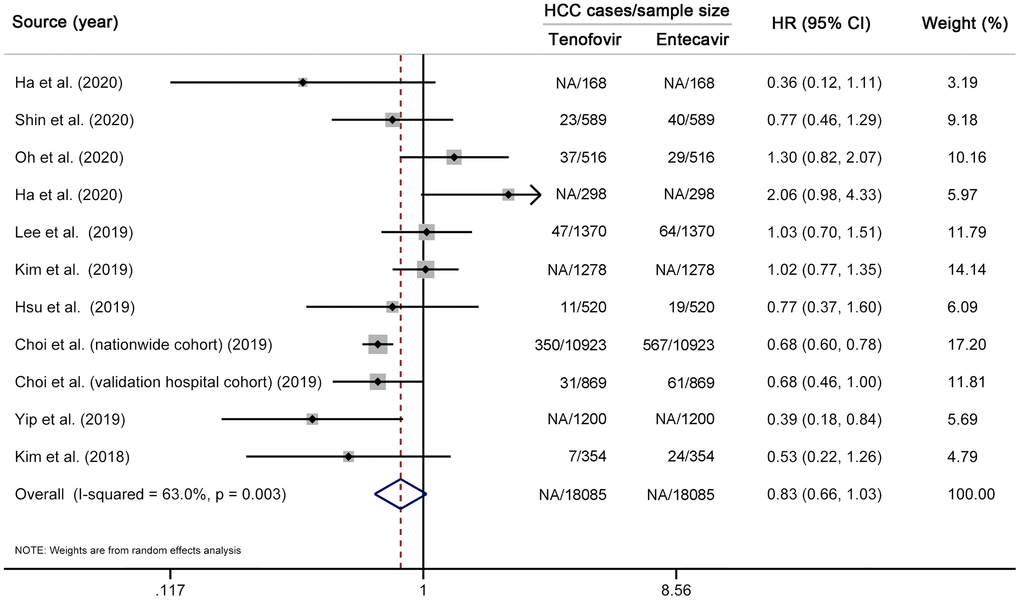 - 29. Tseng CH, Hsu YC, Chen TH, Ji F, Chen IS, Tsai YN, Hai H, Thuy LT, Hosaka T, Sezaki H, Borghi JA, Cheung R, Enomoto M, Nguyen MH. Hepatocellular carcinoma incidence with tenofovir versus entecavir in chronic hepatitis B: a systematic review and meta-analysis. Lancet Gastroenterol Hepatol. 2020; 5:1039–52. https://doi.org/10.1016/S2468-1253(20)30249-1 [PubMed]