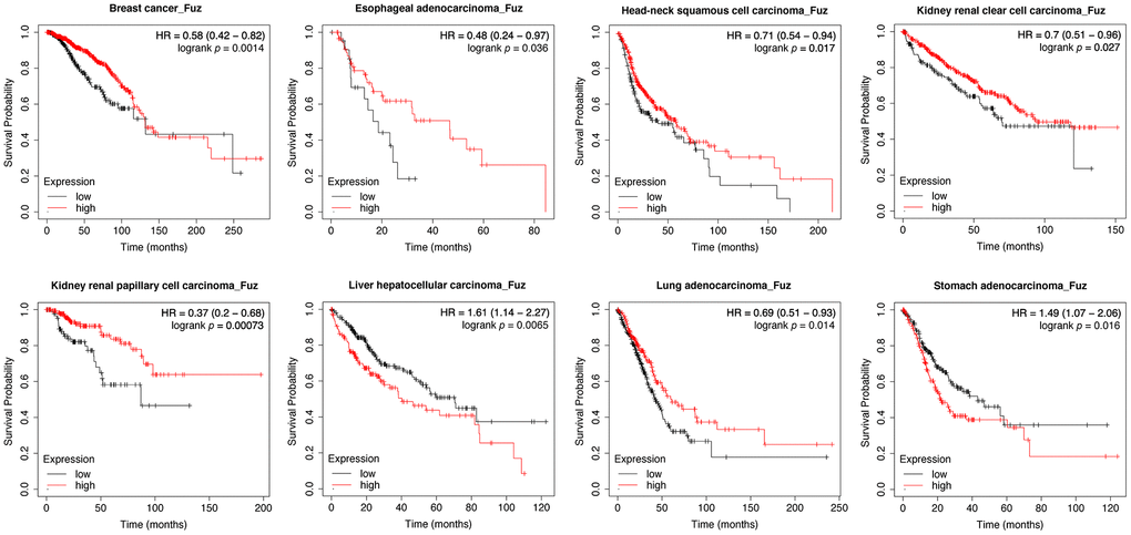 We initially used Kaplan-Meier plotter (https://kmplot.com/analysis/) to assess the prognostic significance of Fuz mRNA expression in 21 different types of cancer. As shown in the Kaplan-Meier curves, Fuz expression was found to be significantly associated with the overall survival (OS) of patients from 8 types of cancer (Figure 1). In liver hepatocellular carcinoma (LIHC) and stomach adenocarcinoma (STAD), increased Fuz transcript level was shown to have poor OS in patients. However, in the remaining 6 types, i.e. breast cancer (BRCA), esophageal adenocarcinoma (ESCA), head-neck squamous cell carcinoma (HNSC), kidney renal clear cell carcinoma (KIRC), kidney renal papillary cell carcinoma (KIRP) and lung adenocarcinoma (LUAD), a reduced expression of Fuz was expected to contribute to decreased survival probabilities (Figure 1). The prognostic significance of Fuz mRNA expression was further assessed in different subtypes of breast cancer. Reduced level of Fuz was found to be significantly associated with poor OS in luminal A and HER2+ breast cancer patients (Supplementary Figure 1A). In addition, the prognostic significance of Fuz in breast cancer (Supplementary Figure 1B), lung cancer (Supplementary Figure 1C) and gastric cancer (Supplementary Figure 1D) was further supported by additional Gene Expression Omnibus (GEO) datasets.