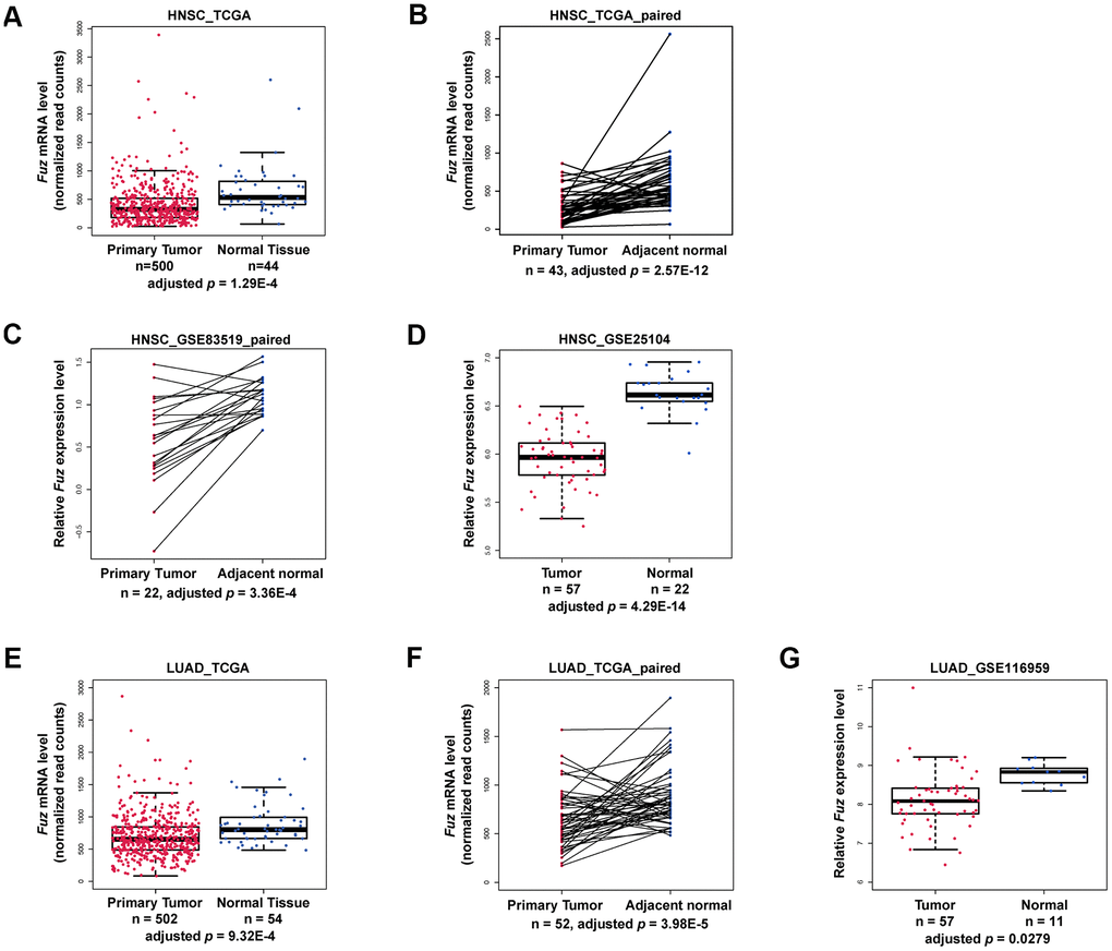 In line with our survival analysis, lowered expression of Fuz detected in HNSC and LUAD tumor samples (Figure 2) coincides with poor OS in patients (Figure 1). We thus decided to focus on HNSC and LUAD in our subsequent studies.