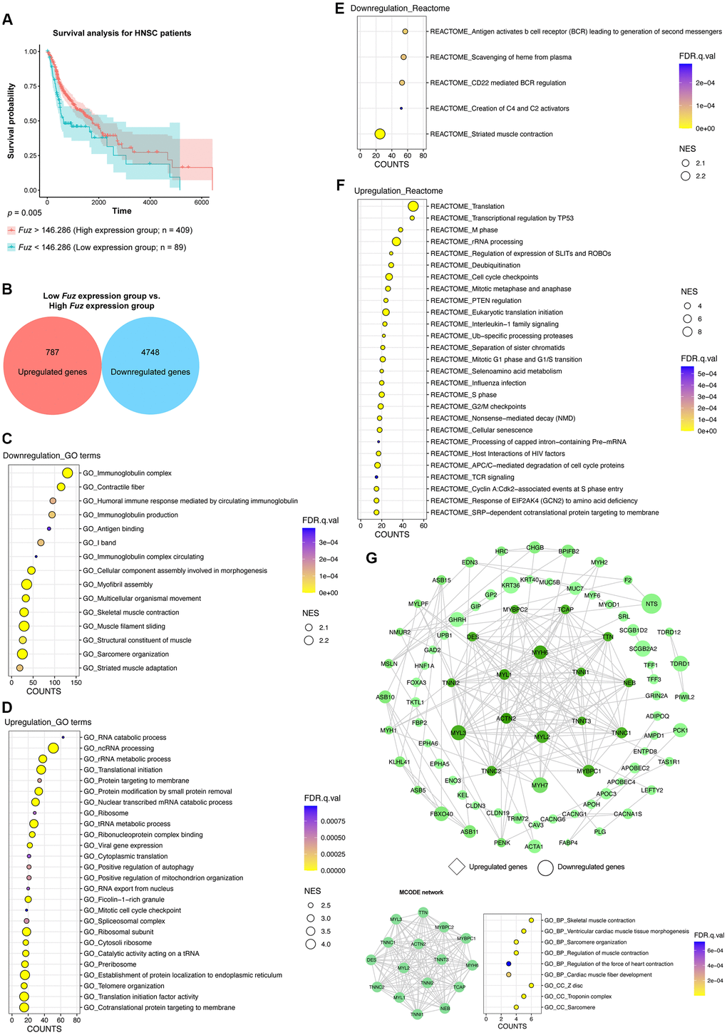 All primary tumor tissues with available patient survival information (n = 498) were divided into high Fuz expression group (n = 409) and low Fuz expression group (n = 89) according to the survival probabilities of HNSC patients. The low Fuz expression group showed poor OS in HNSC (Figure 3A). To gain further insight into the gene expression features in the low Fuz expression group, differential gene expression analysis was performed between low Fuz expression and high Fuz expression groups (Supplementary File 1). The log2FC and adjusted p < 0.001 were used as selection criteria to determine upregulated (787 genes) and downregulated (4,748 genes) gene sets (Figure 3B). We then investigated whether these dysregulated genes are enriched in certain signaling pathways. GSEAPreranked analysis was performed to determine significantly enriched GO terms and Reactome pathways. Compared to the enriched GO terms (15 items) in the downregulated gene set, more (26 items) were found in the upregulated gene set (Figure 3C, 3D). Meanwhile, the Reactome pathway analysis demonstrated 5 enriched downregulated pathways and 27 enriched upregulated pathways (Figure 3E, 3F). We further selected the top 500 dysregulated genes based on the |log2FC| to construct a protein-protein interaction (PPI) network by using the STRING database (https://string-db.org/). The network was visualized using Cytoscape and the densely connected MCODE network was isolated. The MCODE network was consisted of 16 genes, which were found enriched in muscle development, organization and contraction (Figure 3G).